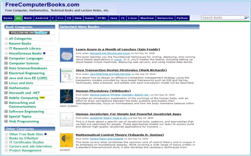 FreeComputerBooks là một cơ sở dữ liệu về khoa học máy tính, lập trình, toán học, kỹ thuật, cung cấp hàng triệu ebook, tạp chí, ghi chú bài giảng, hướng dẫn trực tuyến,… bằng các liên kết đến các website chứa tài liệu trên toàn thế giới. Vì vậy, mọi thứ trong cơ sở dữ liệu này đều miễn phí 100%.