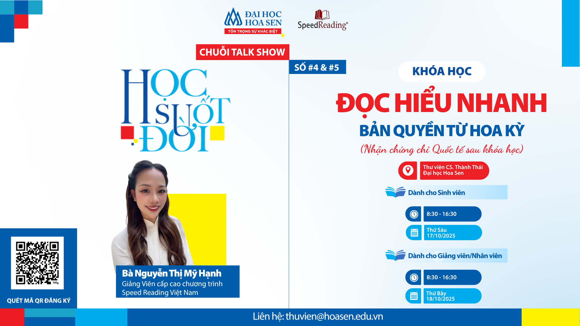 Ngày 17 và 18/10, khóa học “Đọc hiểu nhanh – Speed Reading” dành cho sinh viên, giảng viên, nhân viên HSU đã diễn ra tại Thư viện cơ sở Thành Thái HSU. Chương trình thuộc chuỗi hoạt động “HSU – Học suốt đời”, nhằm giúp HSUers rèn luyện kỹ năng đọc hiểu,..